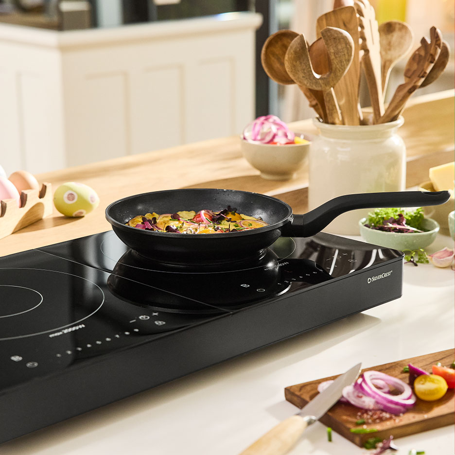 Vårt tips: utrymmet på hällen är begränsat, men viktigt när du förbereder påskbrunchbuffén. En extra bärbar induktionsplatta är energibesparande, snabb och alltid redo när du planerar en större meny!