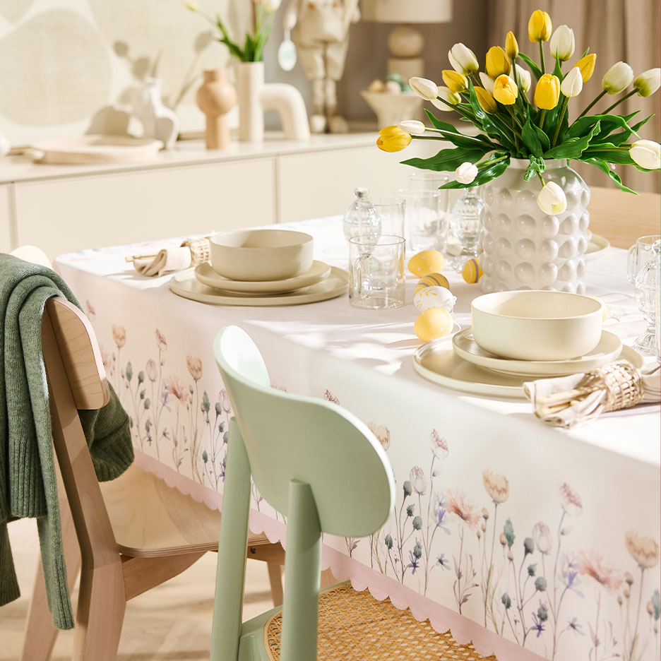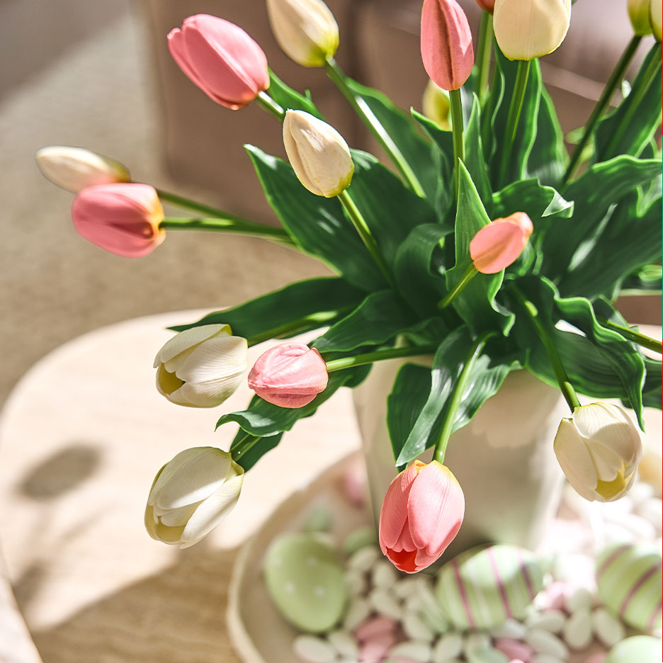 - Om du lägger till pastellfärger på bordet behöver du inte anstränga dig - påskstämningen kommer naturligt. Allt du behöver är en duk i pastellfärg, vårblommor som tulpaner eller påskliljor och söta påskharefigurer. Har du inte tid att gå till floristen? Konstgjorda tulpanbuketter med real-touch-effekt är praktiskt taget omöjliga att skilja från originalet.