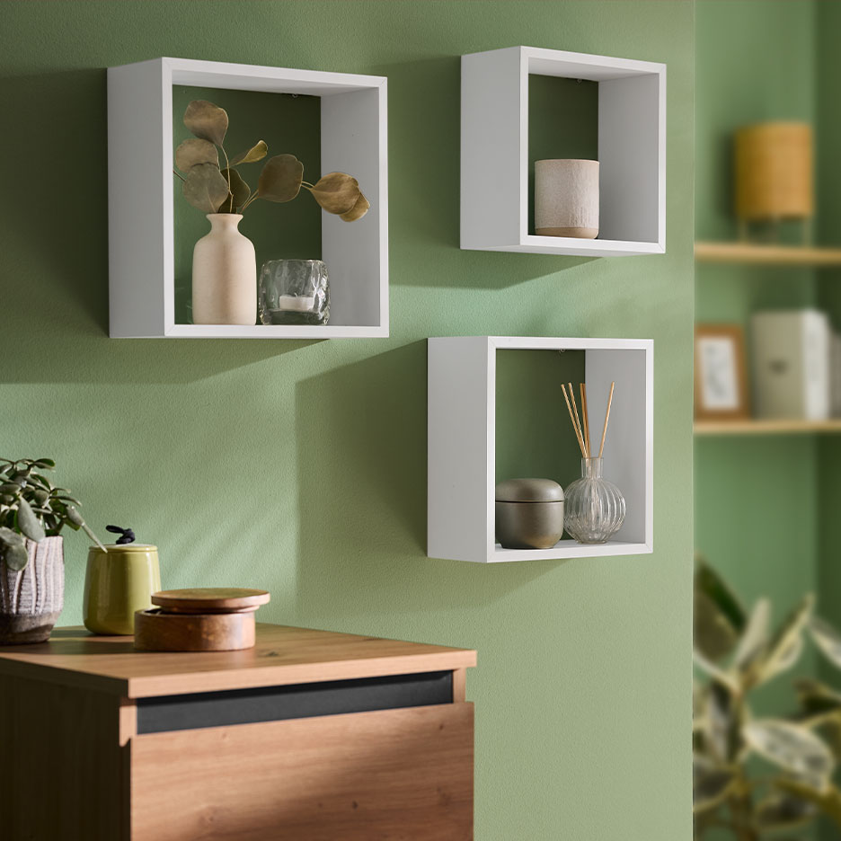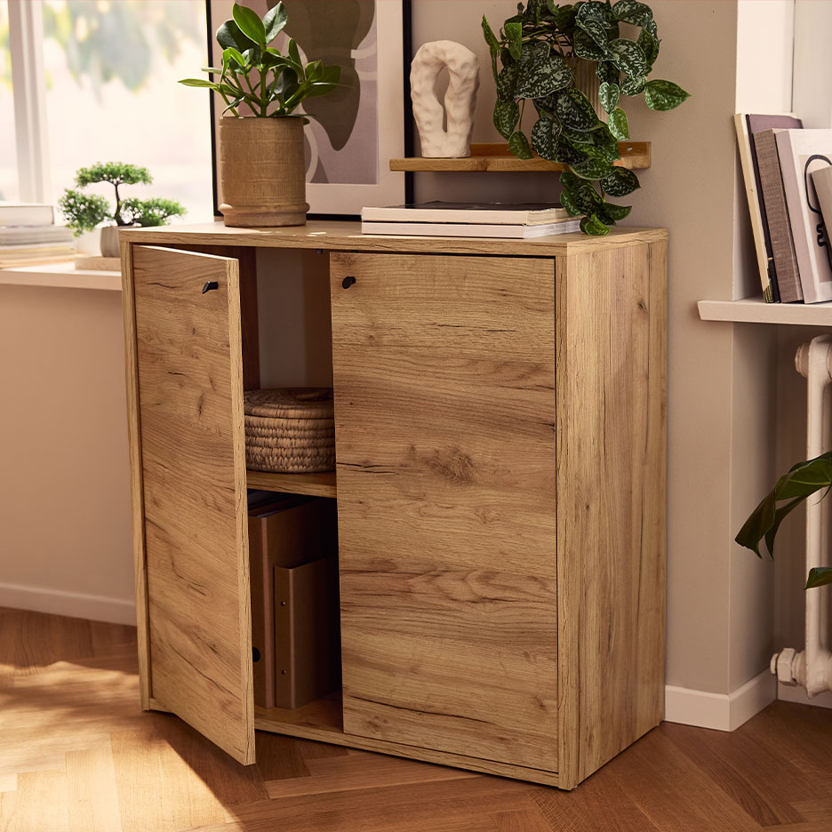 Lågskåp eller byråer med stängda luckor skapar ett lugnt intryck – oavsett om det är rörigt bakom dörrarna. Om du älskar öppna hyllor kan småsaker helt enkelt försvinna ner i fina förvaringslådor och korgar.